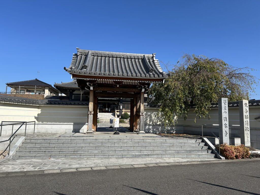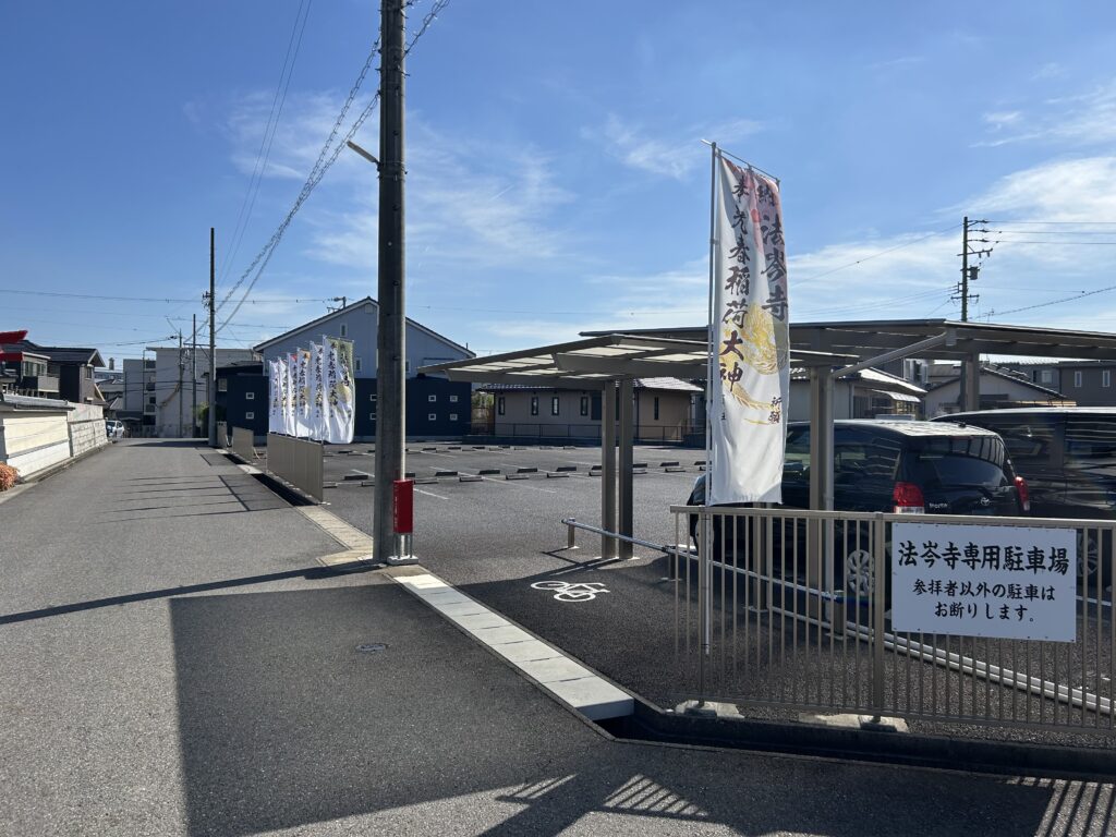 お問い合わせで法岑寺への行き方や場所を聞かれます。比較的大きな通りから入った所となりますので、最初はわかりにくくなってしまいます。現在曲がる箇所に法岑寺の看板がございますのでそちらを目印にしてください。お寺の道路を挟んだ向かいにある駐車場は法岑寺専用です。